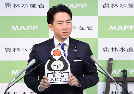 農林水産省は17日、国産米の魅力を国内外に発信することを目的とした「おにぎりプロジェクト」を始動させた。写真は、記者会見で「チームおにぎり」のマスコットパネルを持つ小泉進次郎農林水産相=同省 【時事通信社】