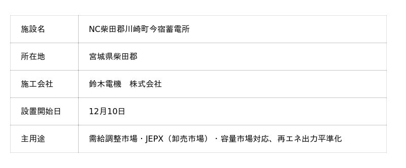 日本蓄電池株式会社(本社:東京都千代田区、代表取締役社長:漆原秀一)は、開発を進めていたNC柴田郡川崎町今宿蓄電所(所在地:宮城県柴田郡)において系統用蓄電池を設置したことをお知らせいたします。