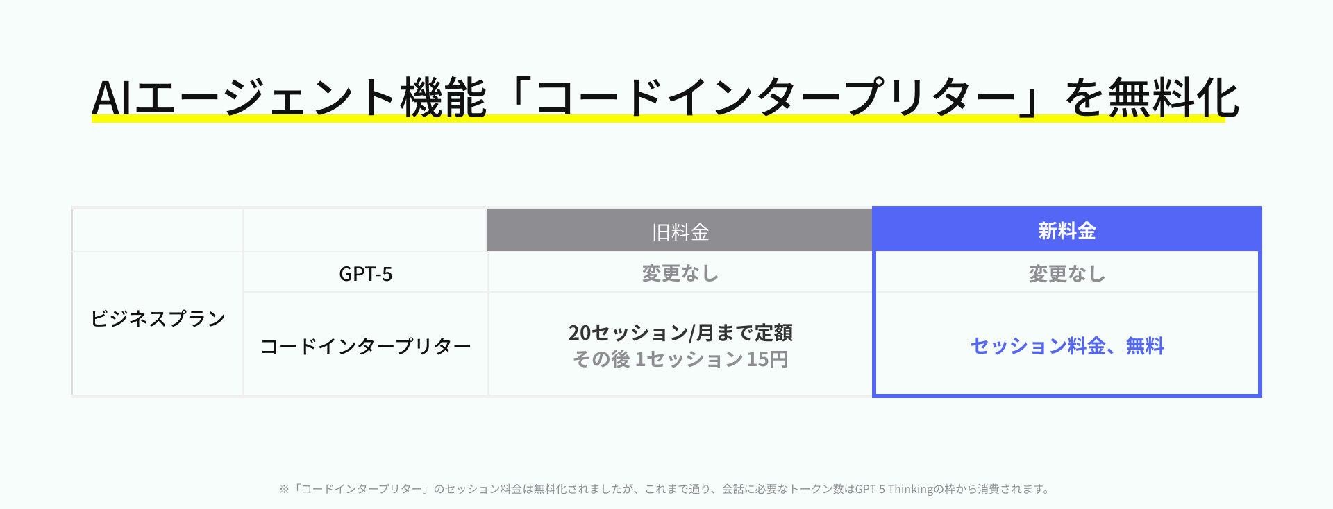 1. 「コードインタープリター」利用料(セッション料金)を完全無料化