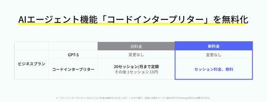 法人向け「AIエージェント」機能の「コードインタープリター」を無料化。