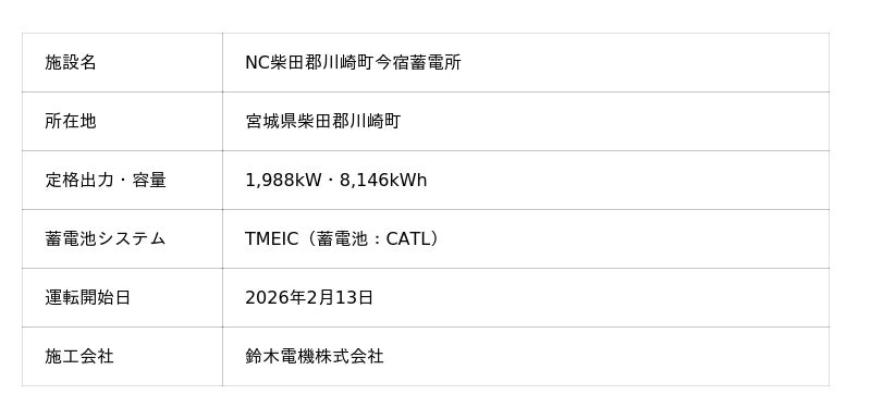 日本蓄電池株式会社(本社:東京都千代田区、代表取締役社長:漆原秀一)は、宮城県柴田郡川崎町に建設した系統用蓄電施設「NC柴田郡川崎町今宿蓄電所」が、2026年2月13日に受電を開始したことをお知らせいたします。