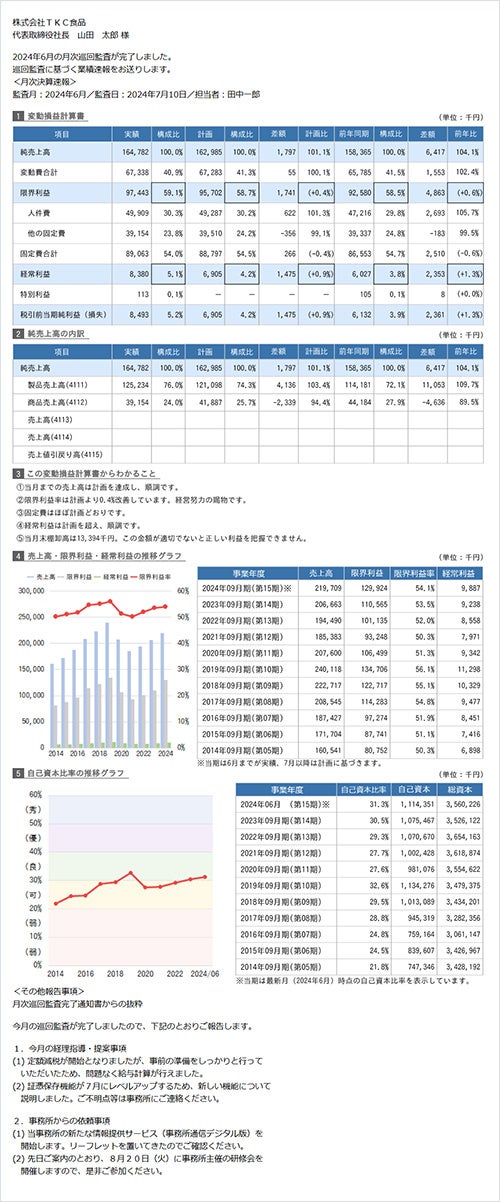 このサービスは、会計事務所の巡回監査終了直後に、中小企業経営者と会計事務所の税理士(所長)に対して、「業績速報」をメールで送信するものです。これにより、中小企業経営者は月次決算実施後の「限界利益率」や「自己資本比率」などをスマホで確認でき、経営改善に向けた迅速な意思決定が可能になります。