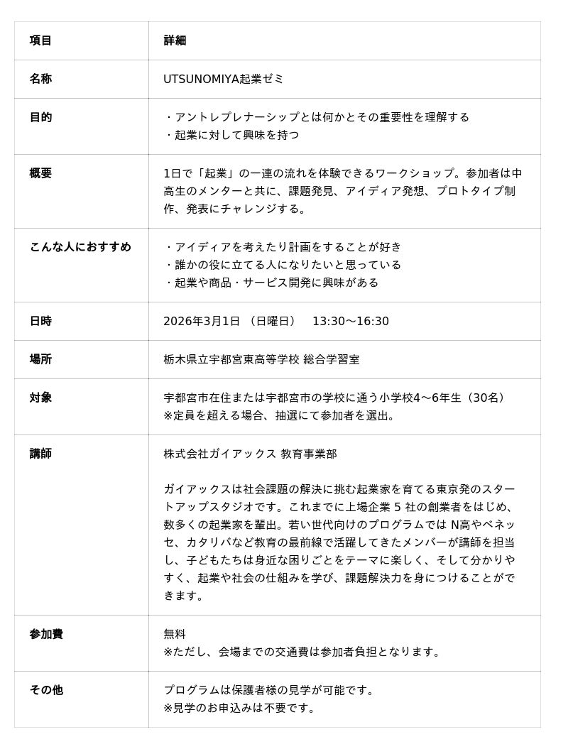 産学官と連携した起業家教育プログラムを提供する株式会社ガイアックス(本社:東京都千代田区、代表執行役社長:上田 祐司、証券コード:3775、以下 ガイアックス)は、起業家の育成支援を行う宇都宮ベンチャーズ(宇都宮市)、栃木県立宇都宮東高等学校・附属中学校と連携し、小学生向け起業家教育ワークショップ「UTSUNOMIYA起業ゼミ」を開催します。本ワークショップでは、小学生が身近な困りごとをテーマに、課題設定からアイディア創出、プロトタイプ制作、発表まで、起業の一連のプロセスを1日で体験することを通して、アントレプレナーシップの重要性や起業の魅力などについて学びます。