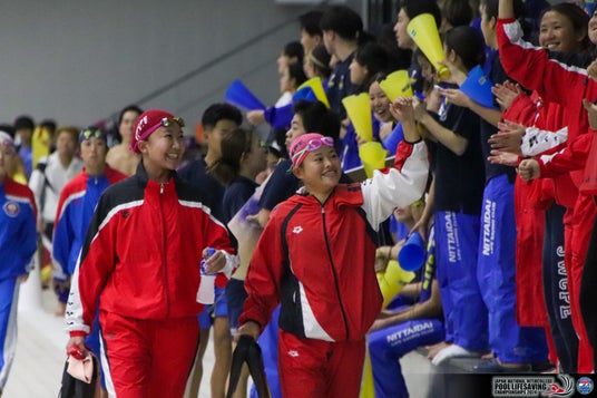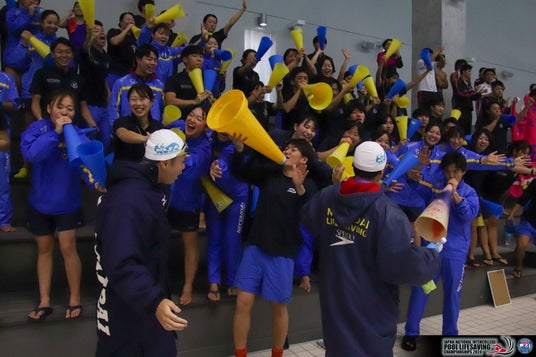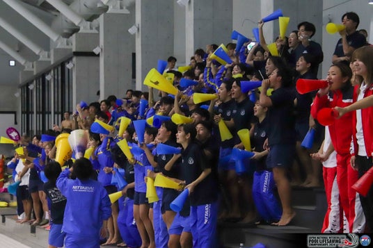 プールサイドにあるウッドデッキをリレーの決勝の際に開放し、入場する選手とハイタッチや、競技エリアにより近くで仲間を応援ができます。インカレのみ行っており、とても好評です。それぞれの大学のカラーによる応援の仕方にも注目が集まります。