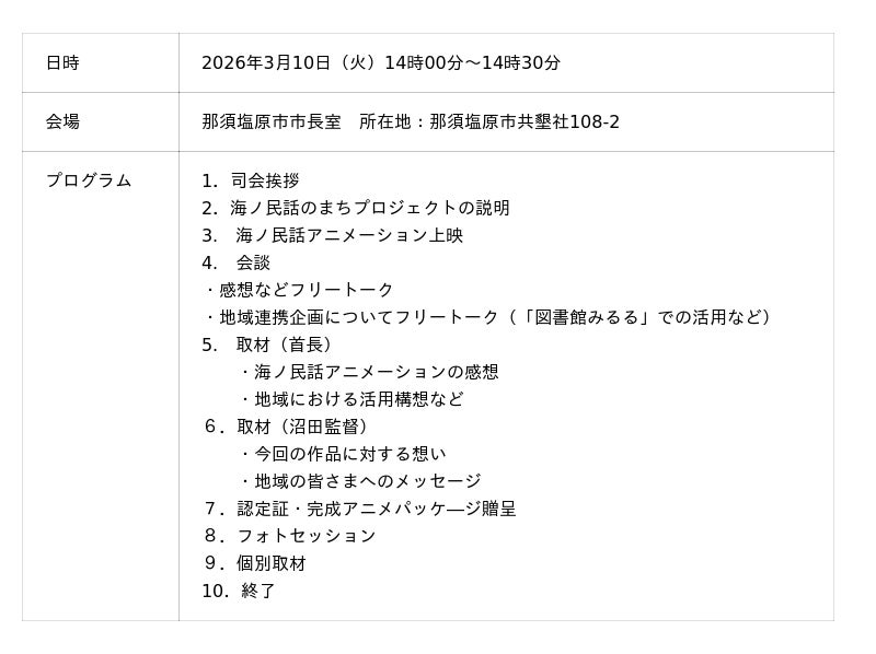 一般社団法人日本昔ばなし協会が取り組む「海ノ民話のまちプロジェクト」は、栃木県那須塩原市を舞台にした海ノ民話アニメーション「弘法清水」が完成したため、3月10日(火)にアニメ監督が那須塩原市を訪問し、アニメのお披露目と「海ノ民話のまち」認定式を実施しました。