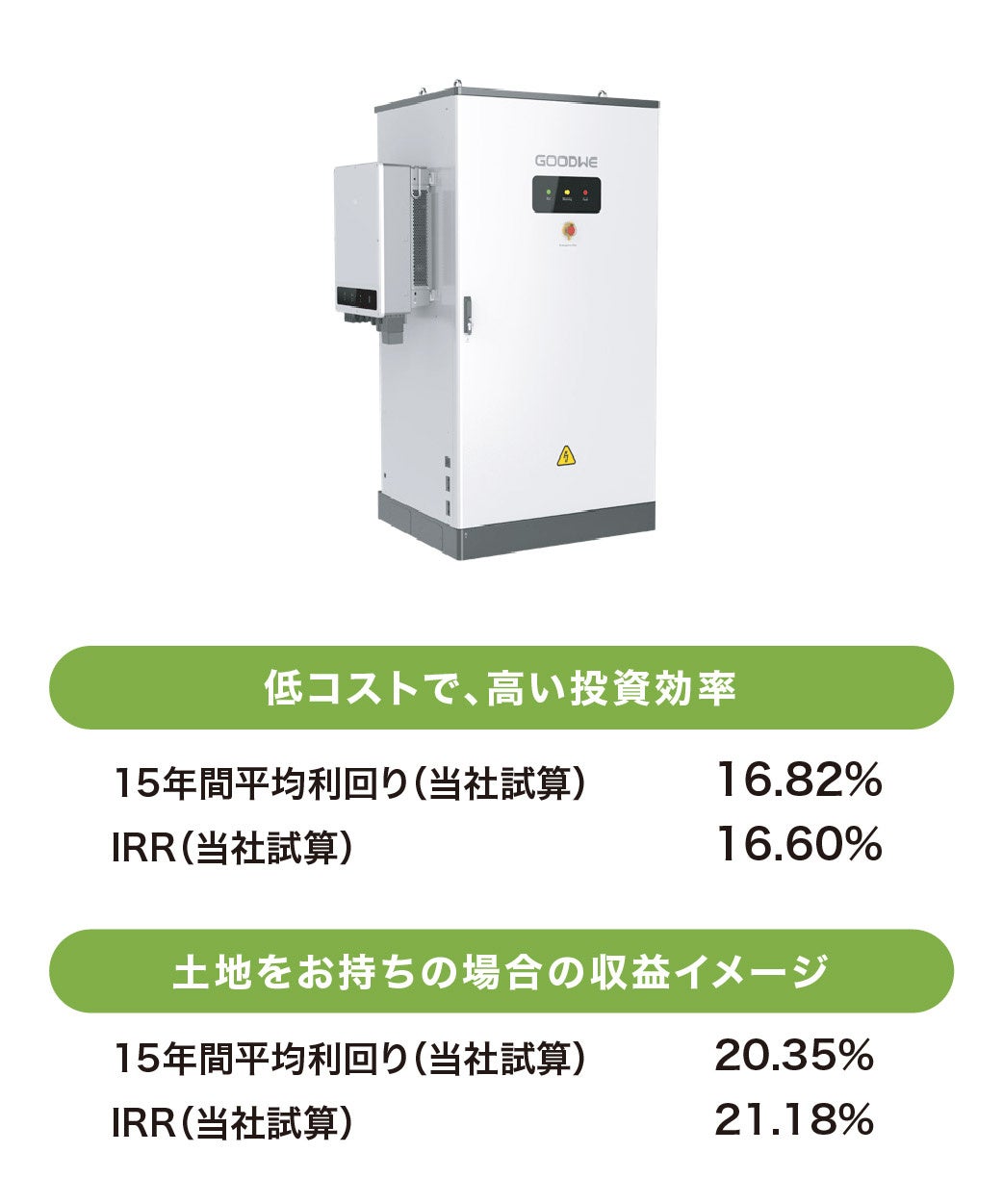 事業スキーム上の参考値として、1案件あたりの設備投資額は約1,700万円(税抜)を想定しており、事業性の指標であるIRRは土地オーナーが自ら事業者となる場合と事業者が土地を借地で行う場合とで異なり以下の通りとなります。