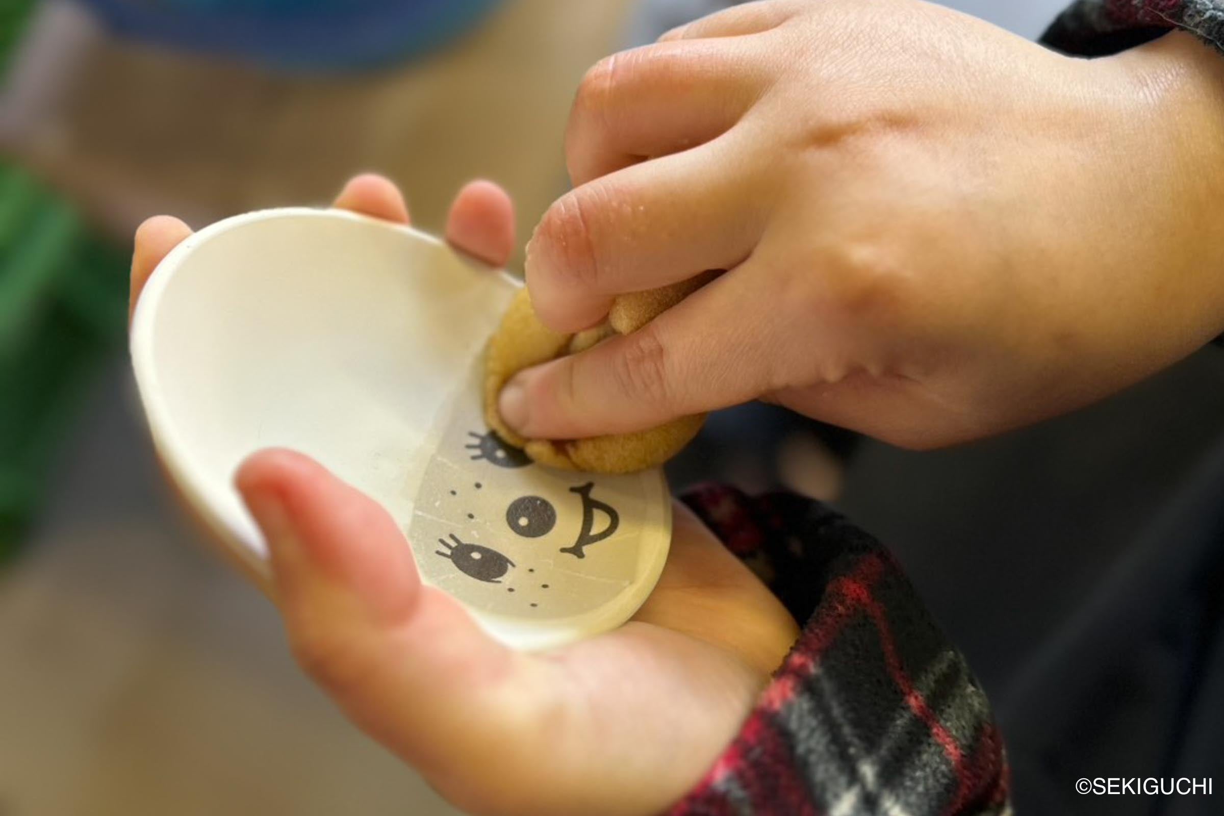 温かみある風合いの益子焼の陶器の豆皿に、モンチッチの顔を皿いっぱいに表現しました。